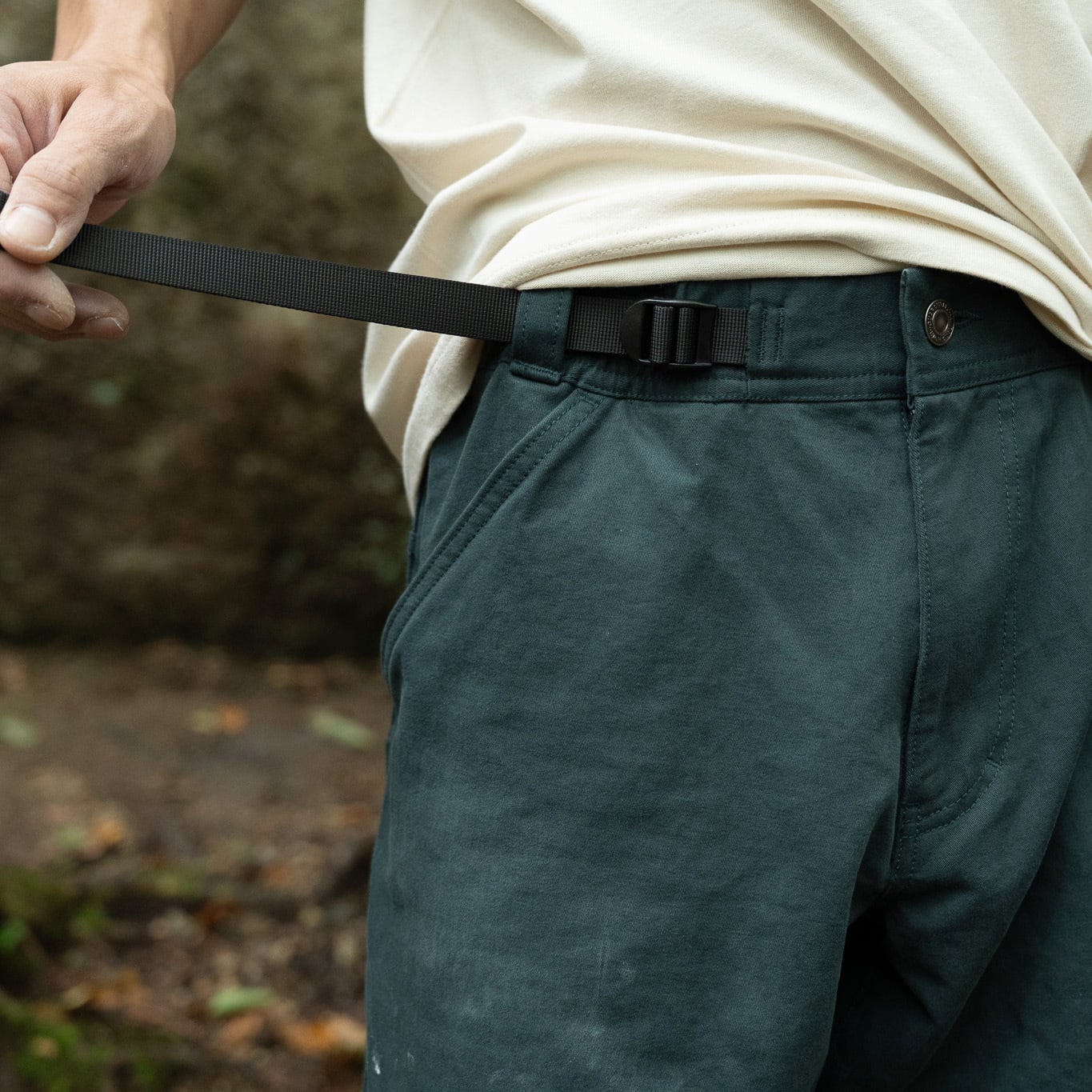 極限までシンプルで無骨:アクセントとしてのデザインは全てそぎ落とし、登りをバックアップする機能(ウエストの調整ベルト・裾のドローコード)のみを詰めました。