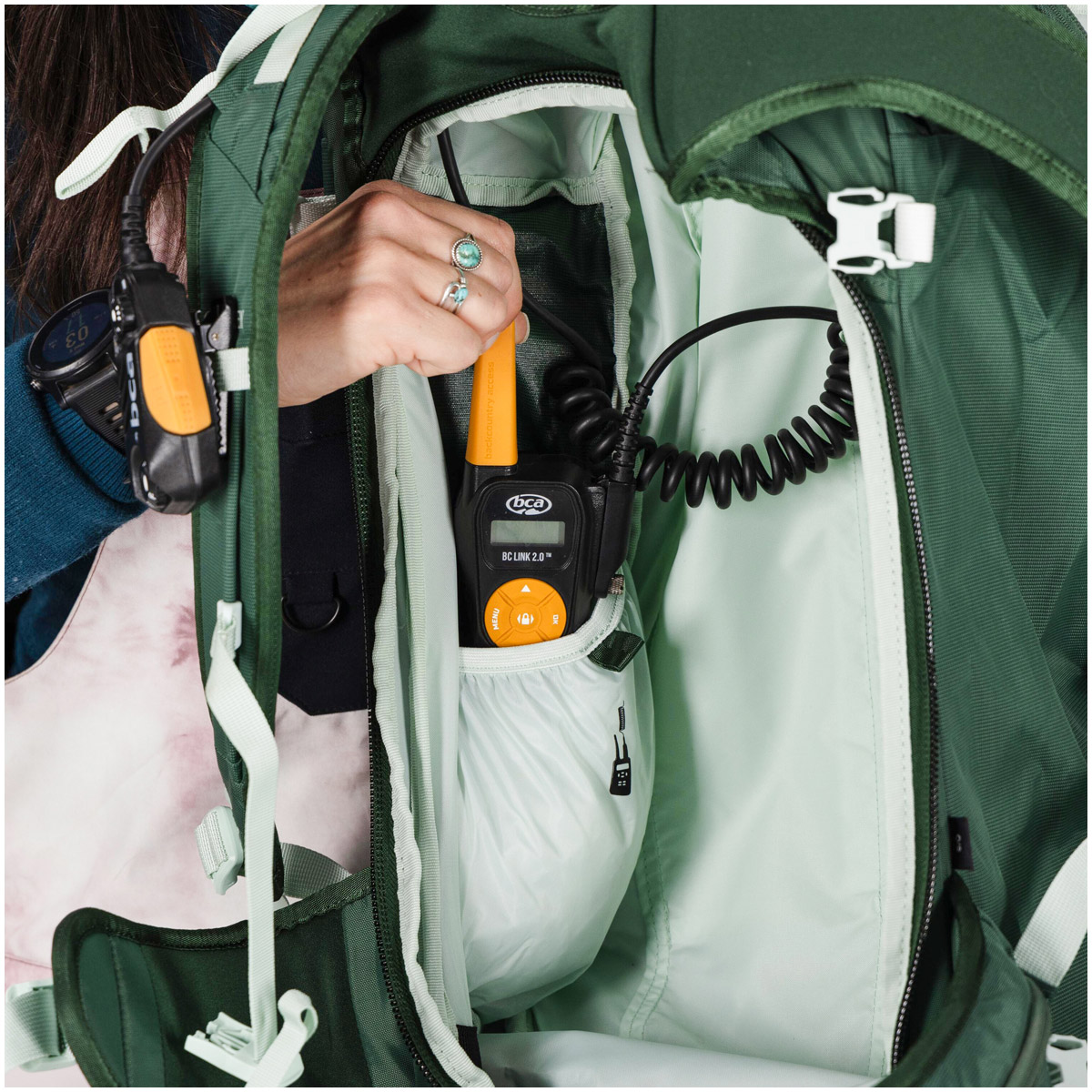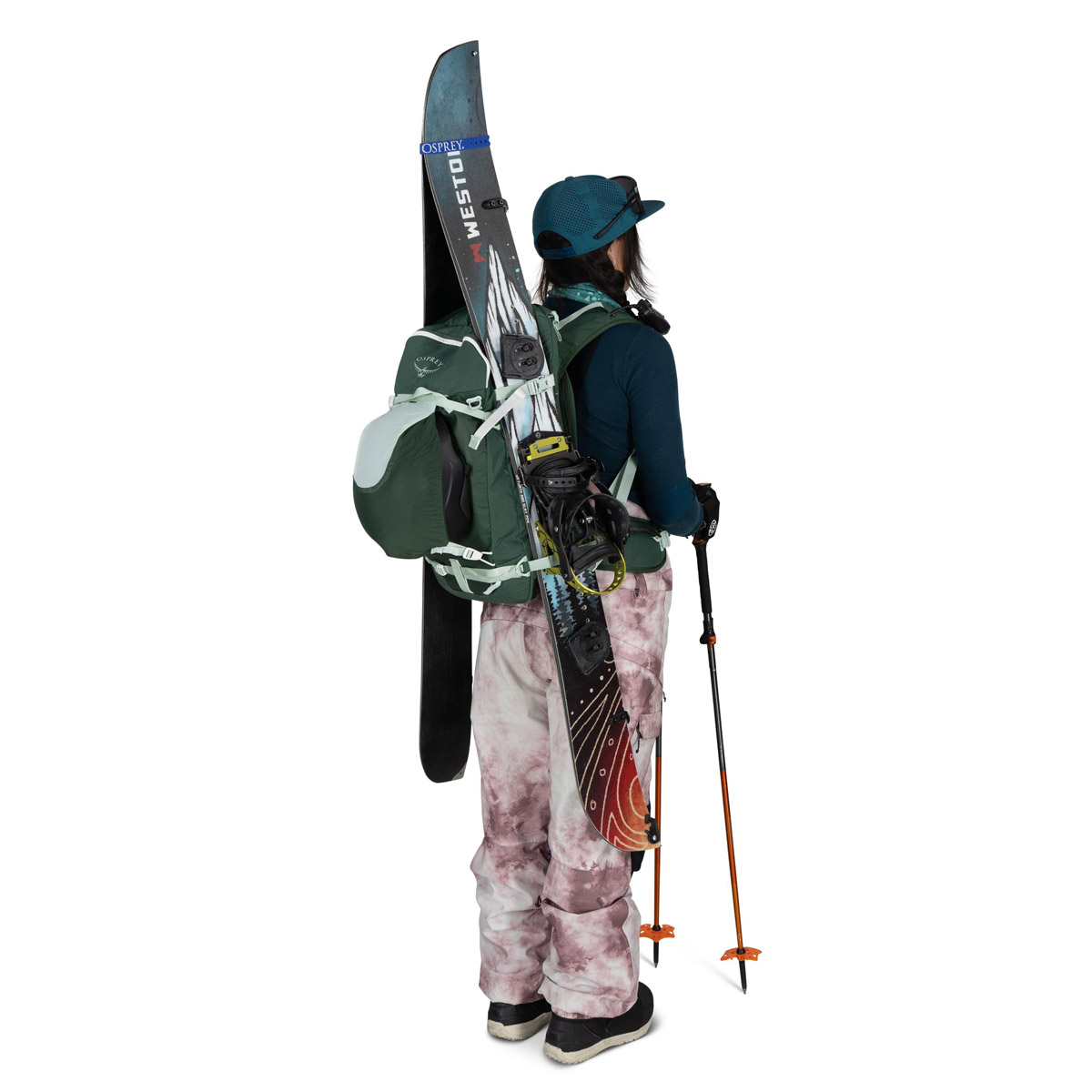 スキーは斜め掛けやAフレームでも装着可能、もちろんスノーボードも装備可能。アバランチポケットには目立つカラーのジッパーを採用し、緊急時でもアバランチギアへの直感的なアクセスが可能です。ヘルメットキャリーやスキー/スノーボードアタッチメントポイントなど、雪山に特化した機能を備えています。