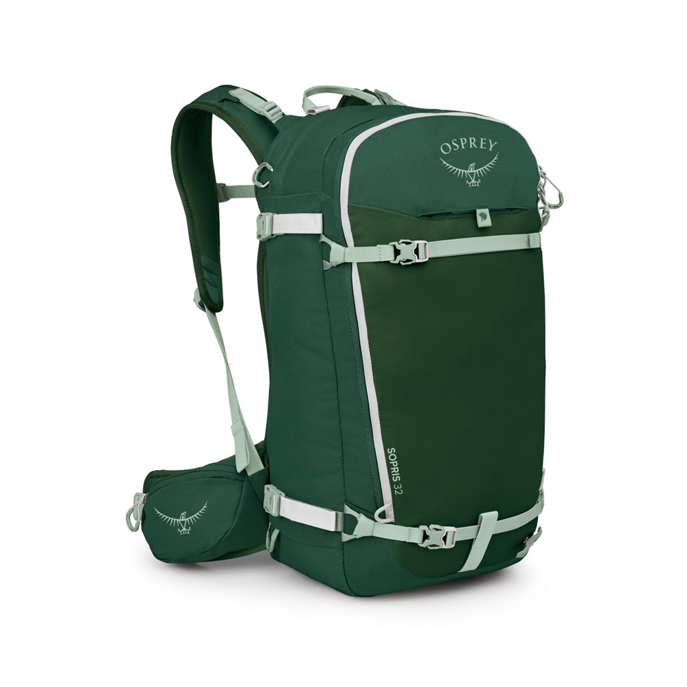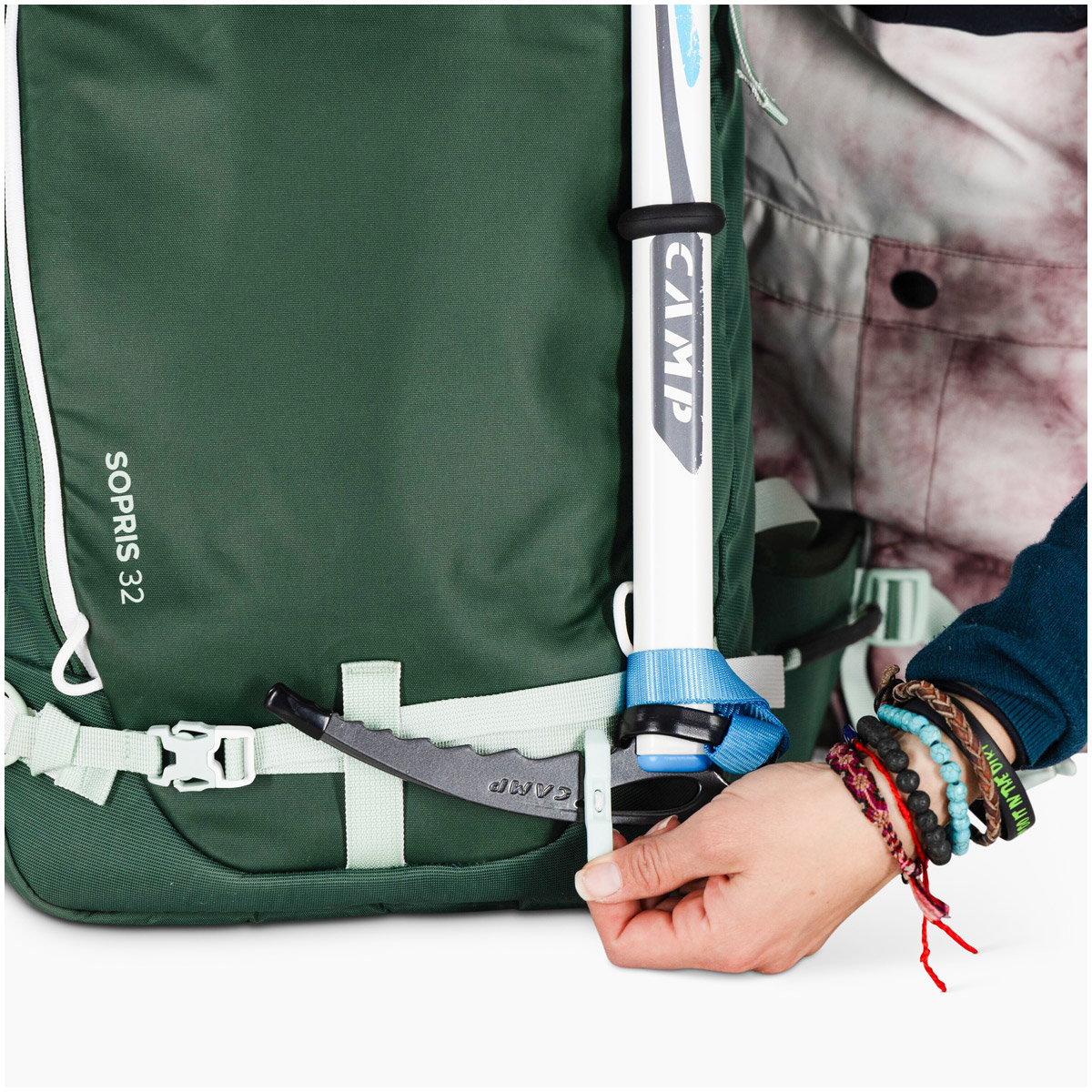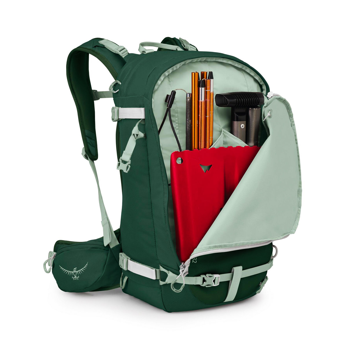 スキーは斜め掛けやAフレームでも装着可能、もちろんスノーボードも装備可能。アバランチポケットには目立つカラーのジッパーを採用し、緊急時でもアバランチギアへの直感的なアクセスが可能です。ヘルメットキャリーやスキー/スノーボードアタッチメントポイントなど、雪山に特化した機能を備えています。
