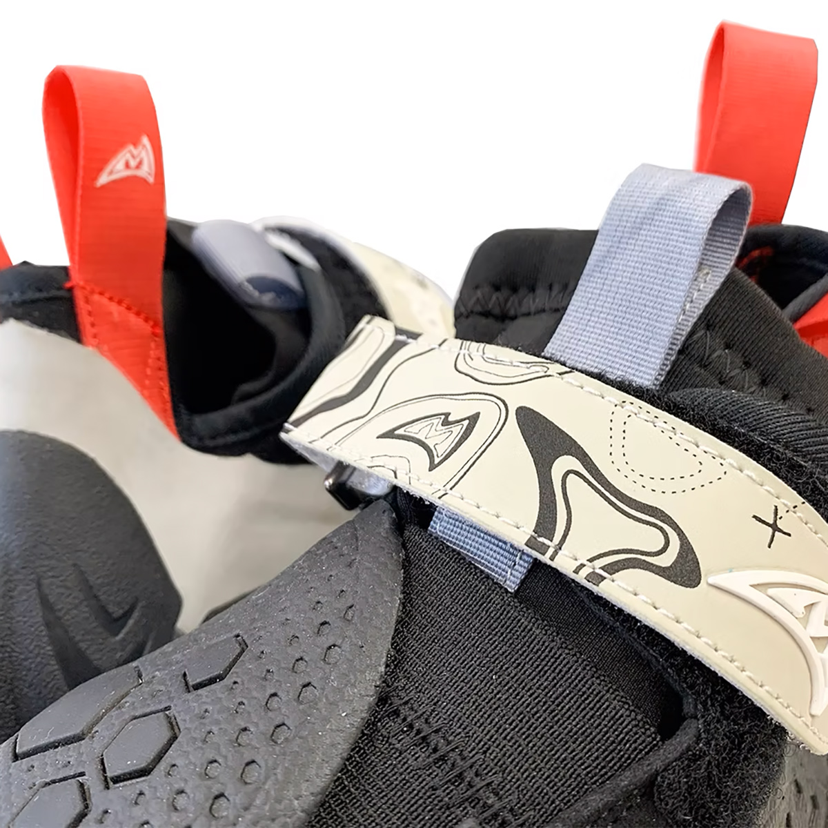 シンプルな通常のD2.ONEとは異なりベルクロにコントワライン(等高線)をデザインモチーフにした柄がプリントされており、ヒールストラップもレッドにイメージチェンジ!
