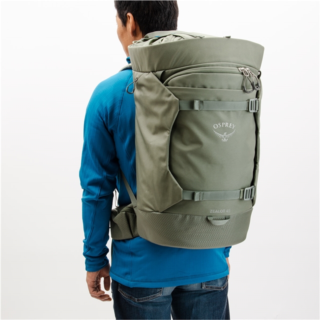 正面はU字型ジッパーで大きく開き、荷物の出し入れがスムーズ。正面、側面、ヒップベルトなどにジッパーポケットを備え、小物を効率よく収納できます。- ロープコンプレッションにもなるフラップジャケット