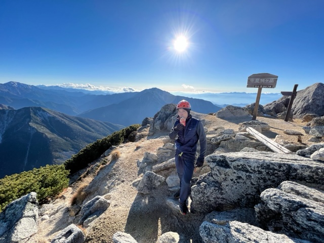 ここからはチェーンスパイクを装着し、15時過ぎに甲斐駒ヶ岳山頂へ到着。週末にもかかわらず最高の天気でのピークを貸切でした。